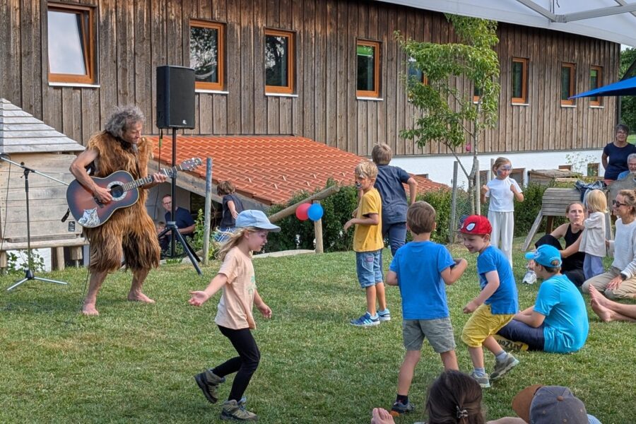 Langsam füllt sich der Spielkreisgarten. Das Buffet wird immer abwechslungsreicher und die Kinder raunen, dass ja heut zum Sommerfest der Wurlitz kommt. Vorher wird noch der komplette Sandkasten umgegraben, weil da Schätze vergraben sind, die geborgen werden müssen. Nach einem köstlichen Eis finden wir uns alle vor der Bühne ein. Weil sehr viele kleine Kinder da sind, zeigt Matthias sein Kostüm, das Fell, das er als Wurlitz tragen wird. Das war für manche Kinder schon eher gruselig. Die Scheu haben dann aber alle abgelegt, als sie gemeinsam Bienen spielten, die ihren Stock verteidigten. Vielen Dank an den Elternbeirat, der so ein wunderschönes Fest gestaltet hat!