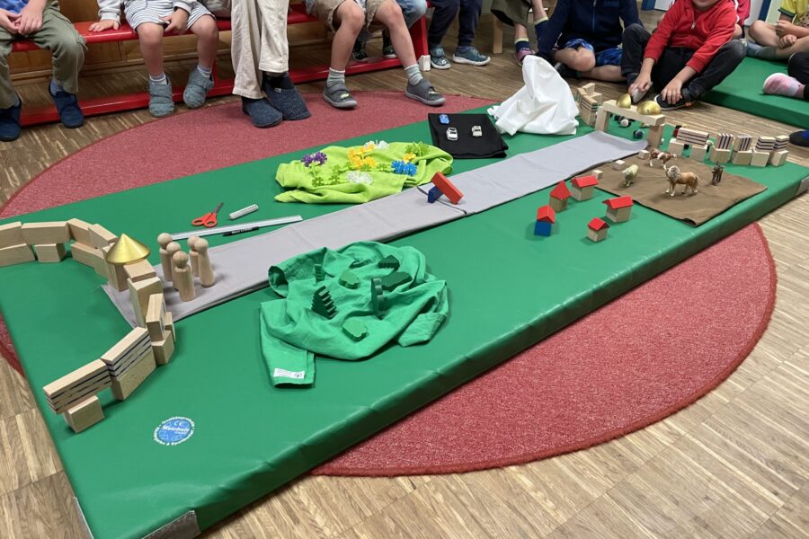 Unser Motto für 2018/19 lautet: „Hier und dort- ich und mein Ort“. Den Spielkreis als Ausgangspunkt nehmend, erkunden wir unsere Umgebung und nehmen alles unter die Lupe. Wo kommen unsere Brezen her? Wer löst den Feueralarm aus? Wer mäht den Schulhof? Wo kann Mama ihr kaputtes Auto hinbringen und wo kommt die wunderschöne Musik in der Kirche her? Wie lange gibt es unseren Ort eigentlich schon und was ist denn überhaupt ein Ort? Das ist da, wo wir uns wohl fühlen und zuhause sind.