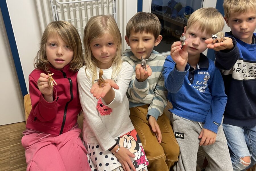 Wie lange doch 12 Minuten sein können! Die Fahrt nach Miesbach dauert für die Chamälions, unsere Vorschüler, gefühlt einen halben Tag. So ein Besuch im Atelier „Farbenspiel“ ist schon etwas Besonderes! Doch dann ist es soweit: „Da sind ja Stifte am Zaum dran!“ freut sich Alma und hüpft freudig Richtung Türe, wie die anderen auch. Schon wird die Türe geöffnet und Barbara Gerbl begrüßt uns freundlich.