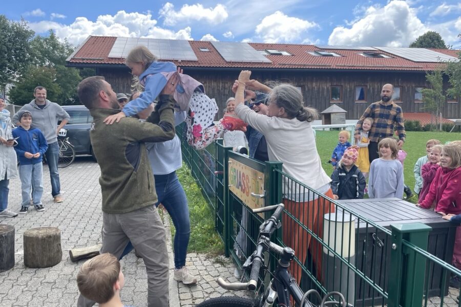 Im Kindergarten haben wir unsere Waldwochen diesmal mit einem gemütlichen Sommerwaldfest ausklingen lassen. Nachdem der Wettergott es doch noch gut gemeint hat mit uns, haben wir uns an einem Nachmittag alle an unserem Waldplatz versammelt. Nachdem unsere Vorschulkinder ein tolles Theaterstück zum Thema „Farben“ aufgeführt haben, ging’s erstmal ans Buffet, bevor sich alle in eine spannende Schnitzeljagd gestürzt haben. Die Eltern hatten anschließend Zeit, mal wieder gemütlich zu ratschen, während die Kinder Freundschaftsbänder geflochten haben, sich auf einem mobilen „Waldtrampolin“ gegenseitig zum Fliegen gebracht haben oder als Feen, Drachen und Traktoren geschminkt wurden. Müde und satt haben wir uns dann abends alle von unserem schönen Waldplatz verabschiedet.