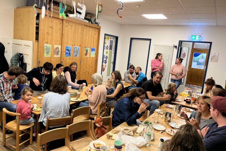 Samstag früh haben sich die Türen des Spielkreises geöffnet. Nach und nach trudeln die Familien, bepackt mit Köstlichkeiten zum Kennenlernbrunch ein. In der Küche entsteht ein vielfältiges Buffet. Es riecht nach Früchtetee und Kaffee. Die Tische füllen sich und es wird gegessen und geratscht. Die Kinder spielen, oder lassen sich in den Gruppenräumen von Eltern vorlesen. Die älteren Kinder führen die jüngeren Kinder und deren Eltern durch „ihren“ Spielkreis. So findet jeder seinen Raum und die Zeit vergeht wie im Flug. Alle konnten sich ein wenig besser kennenlernen und sich austauschen übers Durchschlafen, die besten Kinderrezepte oder Musikgeschmäcker und den letzten Urlaub. Das neue Kindergartenjahr hat super gestartet und wir freuen uns auf mehr solche Zeiten des Zusammenkunft, ob im Elterndienst, oder z.B. beim Adventscafé.