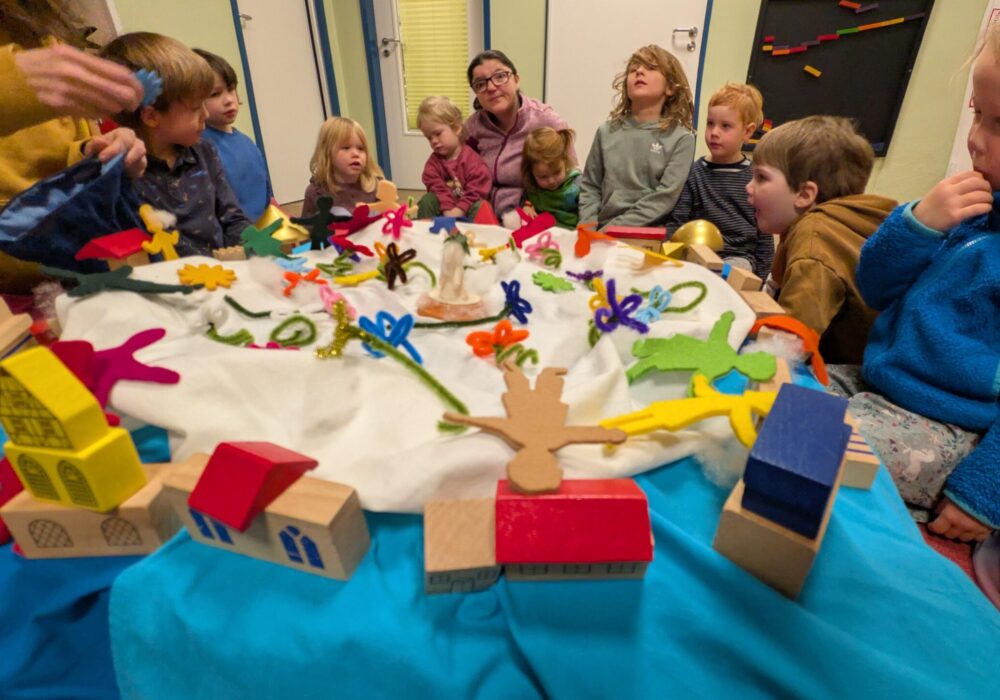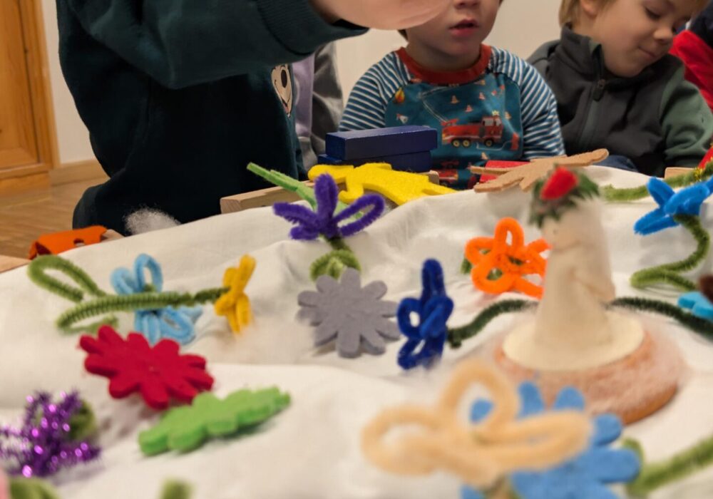 Im gemeinsamen Morgenkreis bekommen wir Besuch von der Neujahrsfee. Die nimmt uns mit in ihren Schlossgarten und zeigt uns die einzigartigen Blรผten, die aus den Wรผnschen und Vorsรคtzen aller Menschen fรผr das neue Jahr gewachsen sind. Jedes Kind hilft mit beim Gestalten der Kreismitte. Wir bauen ein Schloss aus Holzsteinen, setzten Blรผten in den Garten und beleben alles mit Kindern aus Filz. Was habt ihr euch fรผr das neue Jahr vorgenommen? Die Kinder รผberlegen โmehr aufrรคumenโ โ sich Neues trauenโ โweniger Sรผรesโ โBruder nicht mehr รคrgernโ. Alles wird in den Garten gepflanzt. Jetzt bekommt jedes Kind ein Chiffontuch und der โBlumenwalzerโ aus der Nussknacker erklingt. Die Kinder beginnen sich langsam zu bewegen. Sie kreisen mit den Armen und drehen sich um sich selbst. Sie hรผpfen und springen und schwenken die Arme auf und ab. Ein buntes Meer aus Tรผchern entsteht und man hรถrt die Kinder glucksen und lachen. Wir finden, das war ein gelungener, bunter Start ins neue Jahr und hoffen dass uns diese Ausgelassenheit und Freude das ganze Jahr begleiten wird.