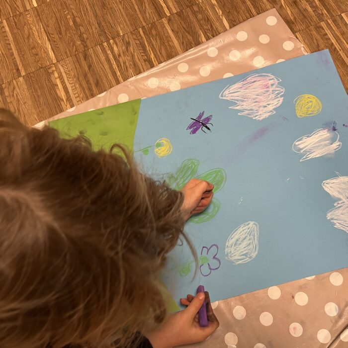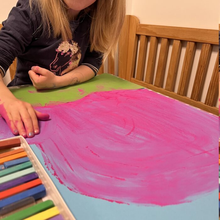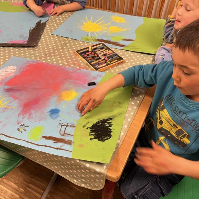 Heute nach der Brotzeit haben wir eine Reise durch eine Frรผhlingslandschaft unternommen. Antonio Vivaldis vier Jahreszeiten begleiteten uns. Was hรถren wir? Instrumenteโฆaber was fรผr Bilder gehen uns durch den Kopf, wenn wir die Augen schlieรen? Wir hรถren die Vรถgel, die รผber uns im Baum sitzen und ein Liedchen trรคllern. Wir hรถren die Bienen, die geschรคftig ihrer Arbeit nachgehen. Schmetterlinge flattern an uns vorbei und in weiter Ferne grollt es schon. Jedes Kind bekommt ein groรes Blatt Papier und versinkt ins eigene Bild, das nach und nach Gestalt annimmt. Jedes Kind geht anders an das Thema heran- hat im Kopf seine ganz eigene Vorstellung des Frรผhlings. Manche sitzen am Tisch, andere malen am Boden. Manche tippen zum Takt der Musik mit der Fuรspitze auf den Boden, andere summen leise mit. Als alle fertig sind, haben die Kinder die Idee, ihre Kunstwerke den anderen zu zeigen. Schnell sind Tickets fรผr die โFrรผhlingsausstellungโ gebastelt und die Kinder prรคsentieren stolz ihre Werke. In jedem Werk finden sich Elemente, die besonders interessant sind und so kommen alle gemeinsam ins Gesprรคch. Besonders die jรผngeren unter den Kรผnstler*innen waren sehr gerรผhrt, dass sie von รคlteren Kindern so tolles feedback bekommen haben. Vielleicht lassen wir die Ausstellung noch ein wenig hรคngen, damit sie auch von Eltern und Geschwistern bewundert werden kann.